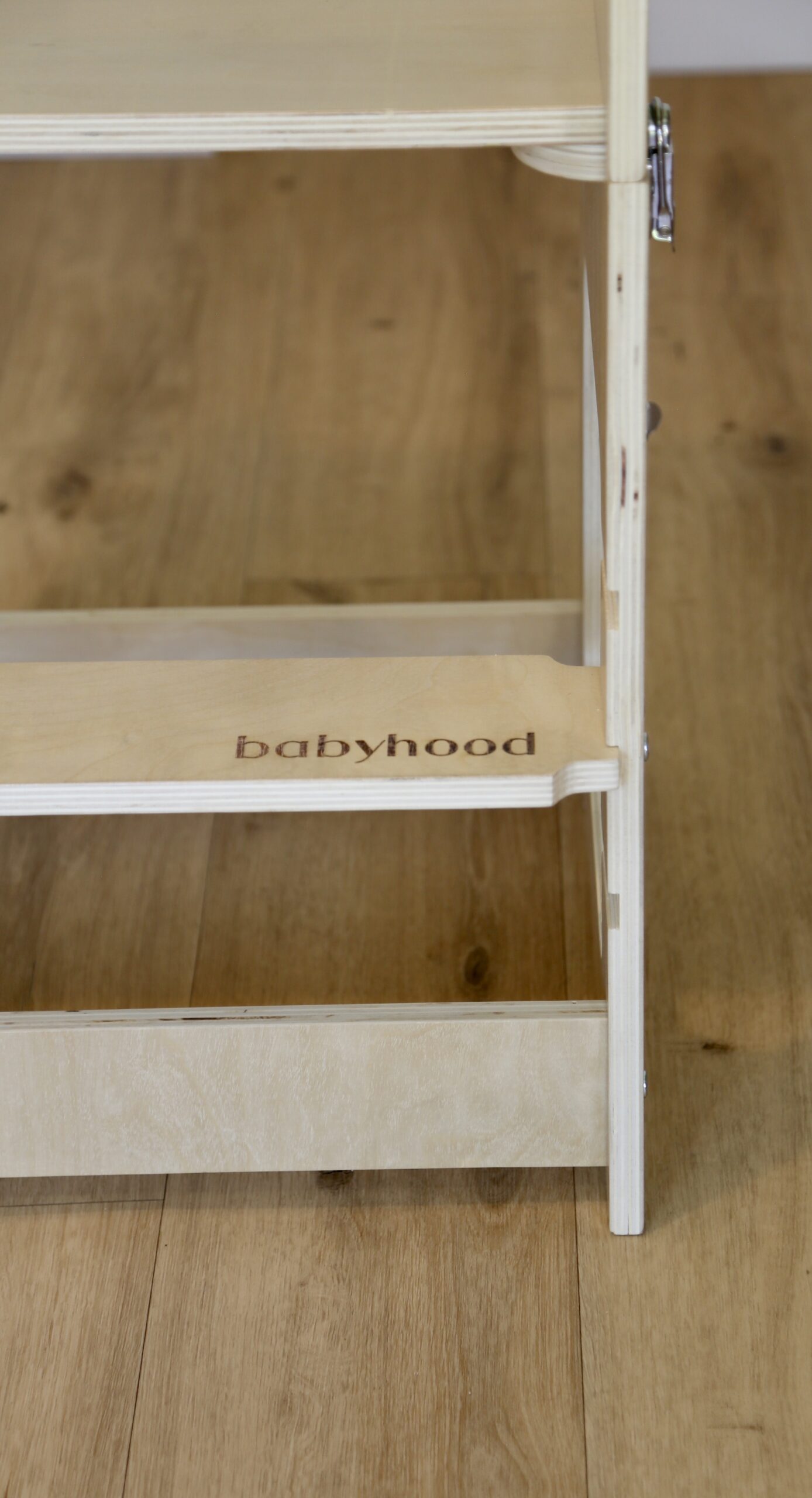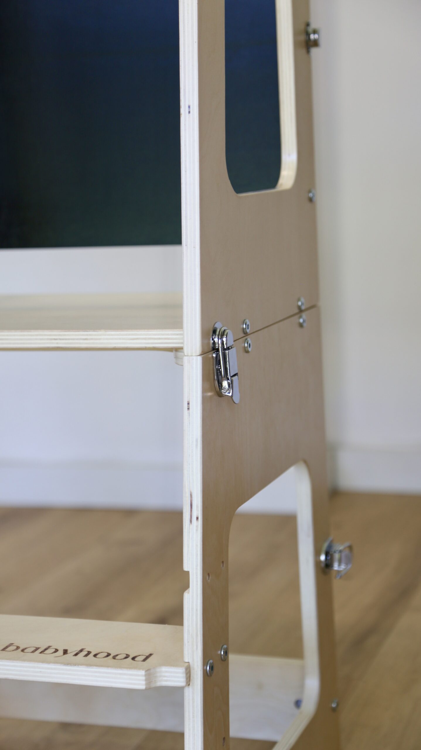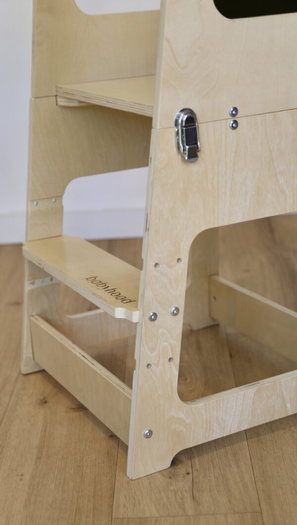 - Escalón Ajustable de Tres Niveles: Se adapta al crecimiento de tu hijo. Con tres alturas de plataforma, garantiza que siempre estará a la altura perfecta para la encimera o la mesa, ofreciendo una solución duradera desde la infancia hasta la niñez.